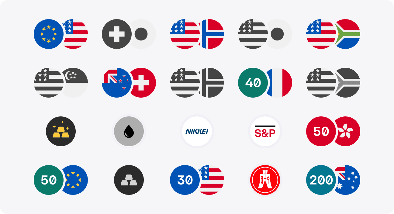 Designed to represent our trading products, these icons include symbols for currency pairing, commodities, and indices. Product icons are essential for quickly identifying and differentiating the various instruments available on our platform, ensuring that traders can easily recognize what they’re interacting with.