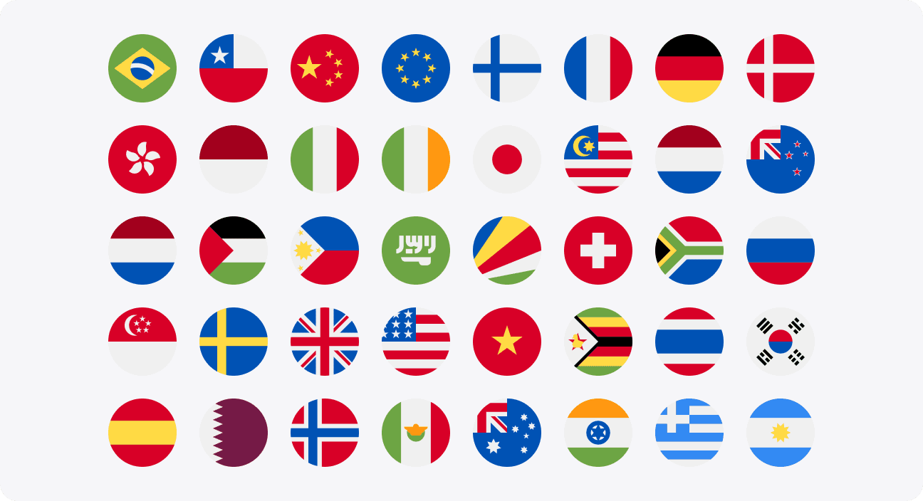 Flag icons are used to represent individual countries, especially when referring to national identities or currencies. They are particularly useful for selections, such as choosing a country of residence or a deposit currency where a distinct visual identifier is necessary to avoid any ambiguity.